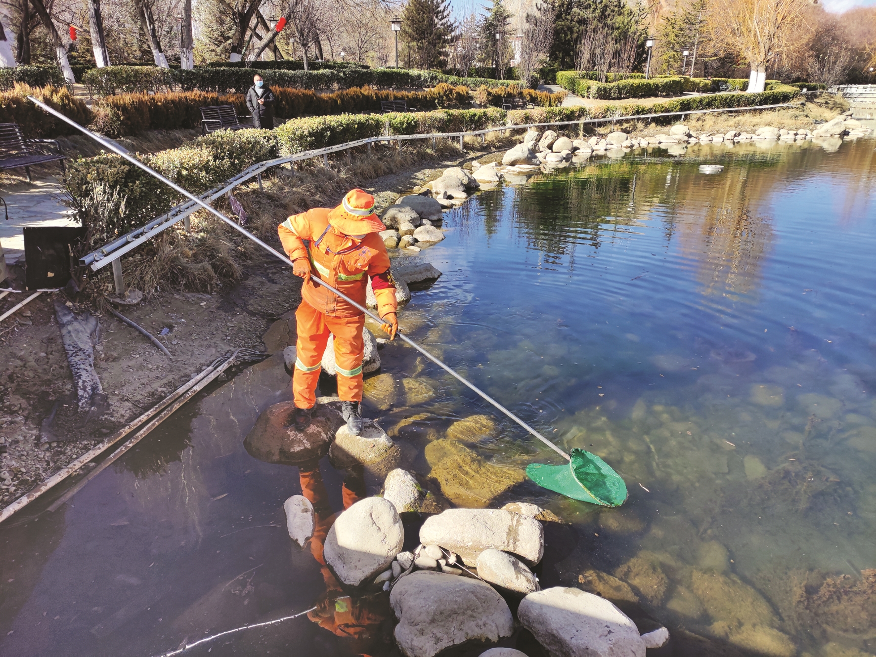 圖為布達(dá)拉宮廣場管理處工作人員手持長柄網(wǎng)兜打撈水里的垃圾。拉薩融媒記者 趙耀鐵攝