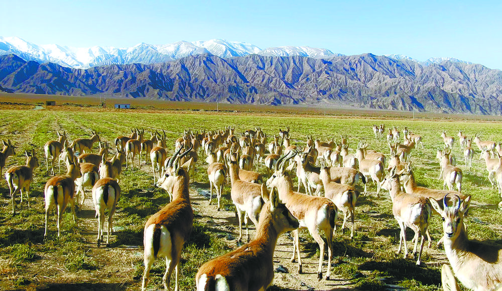 近日,200余只鵝喉羚集聚在海西蒙古族藏族自治州烏蘭縣呼德格勞牧場苜蓿草種植基地內(nèi),或悠閑吃草,或漫步在廣闊的牧野中,與背后的雪山構(gòu)成一幅人與自然和諧共處的美麗畫卷。