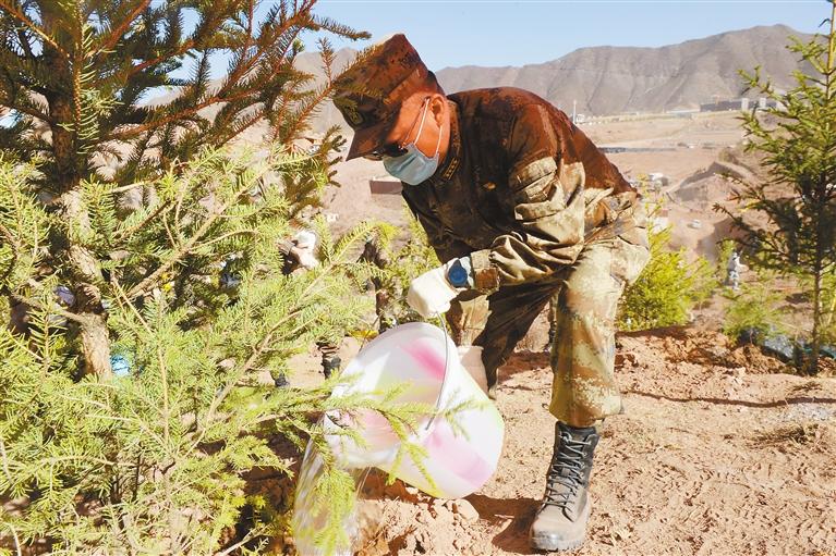 圖為官兵正在給樹苗澆水灌溉。