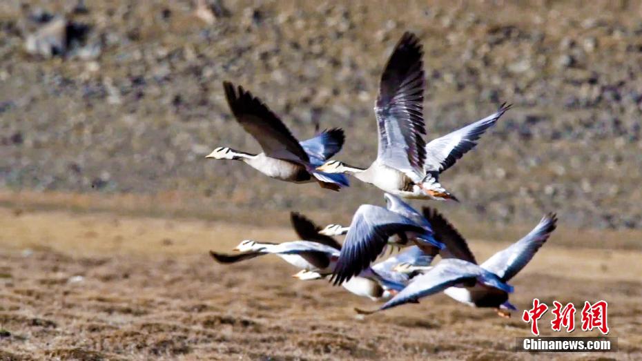 日前,“高原藍(lán)寶石”青海湖迎來大批候鳥安營(yíng)筑巢。圖為飛翔的斑頭雁。 張世偉 攝