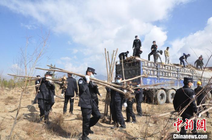 圖為西藏邊檢總站輪訓(xùn)大隊(duì)民警植樹活動(dòng)現(xiàn)場(chǎng) ?!∥鞑剡厵z總站輪訓(xùn)大隊(duì)供圖