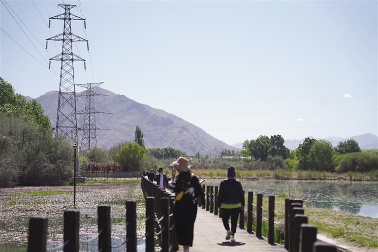 “走進拉魯濕地,生機勃勃的盎然綠意、層次分明的景色讓人心曠神怡。遠處,連綿起伏的山頂還覆蓋著薄薄的積雪,布達拉宮美輪美奐;近處,濕地內的一塊塊水泊,成群的候鳥在水中玩耍嬉戲、在藍天白云下飛翔?!庇慰屯醴颊f,“我和家人剛來拉薩,聽朋友說拉魯濕地已經(jīng)開放,就想來打卡,也是第一次來拉魯濕地,這兒的空氣濕度適宜,在拉魯濕地運動,不僅能享受運動帶來的快樂,還能欣賞怡人景色。”