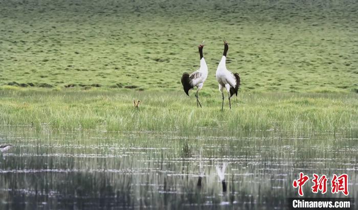 圖為黑頸鶴夫婦以高聲合鳴的方式宣誓領(lǐng)地,威懾入侵者。 張景元 攝