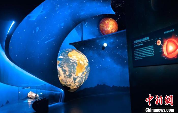 邁步進入“地質(zhì)環(huán)境廳”,最最吸睛的,是一個巨大的、緩慢旋轉(zhuǎn)的“地球”,在深藍色的夜空背景下,地球上的紋理分毫畢現(xiàn)。頂層用微型燈組成的“星空”時不時有流星劃過,照亮了太陽系的其他行星。整個太陽系被高仿真還原,帶光環(huán)的土星、赤紅色的火星、體積最大的木星……