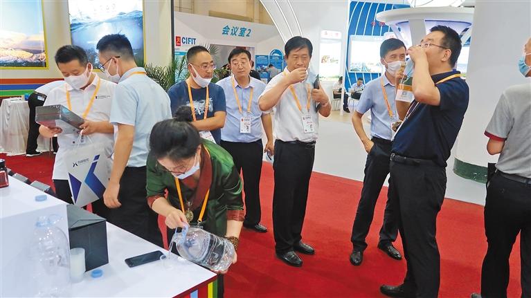 近年來,西藏加快發(fā)展飲用水產(chǎn)業(yè),積極拓展飲用水產(chǎn)品銷售渠道,在區(qū)內(nèi)外各種展覽會(huì)、展銷會(huì)、博覽會(huì)上大力推銷水產(chǎn)品。 圖為2020廈門國際投資貿(mào)易洽談會(huì)暨絲路投資大會(huì)上,與會(huì)者在展示展銷會(huì)現(xiàn)場(chǎng)品鑒西藏“地球第三極”產(chǎn)業(yè)發(fā)展有限公司生產(chǎn)的天然飲用水產(chǎn)品。(資料圖片)記者 王超 攝