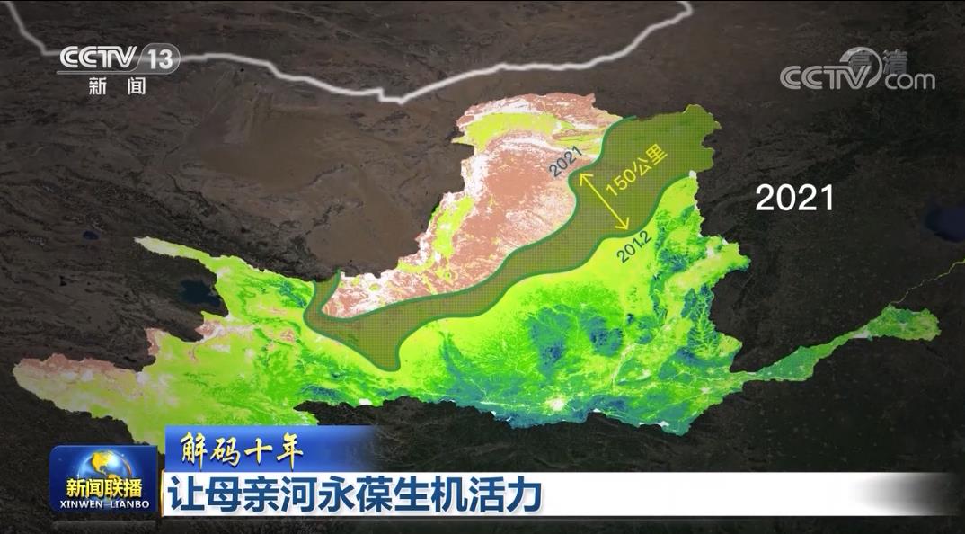 這是衛(wèi)星視角拍攝到的黃河,研究人員連續(xù)數(shù)年監(jiān)測,結合大數(shù)據(jù)還原了黃河沿岸的生態(tài)狀況??梢郧逦乜吹剑觊g綠進沙退,這條黃河生態(tài)綠線最寬處向前推進了約150公里。