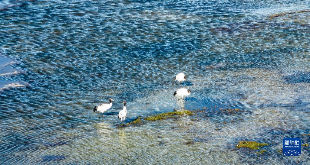 9月16日在多慶湖邊拍攝的黑頸鶴(無(wú)人機(jī)照片)。新華社記者 晉美多吉 攝