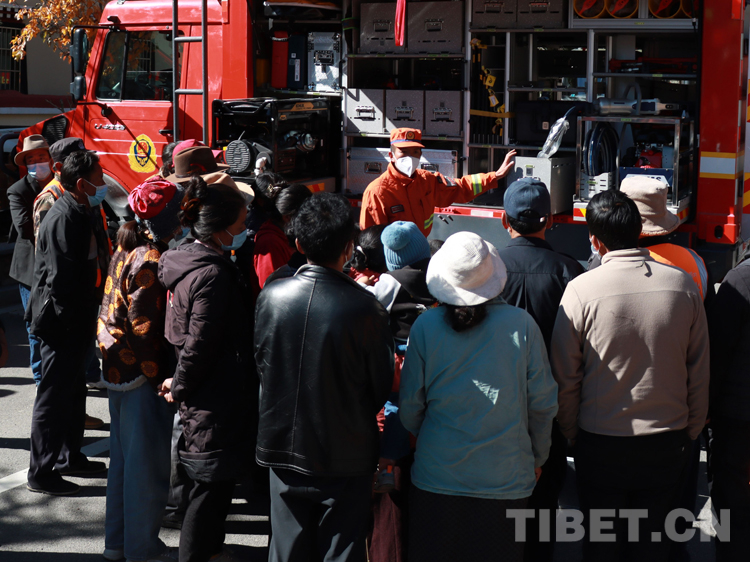 圖為消防員正在向群眾講解裝備操作方法