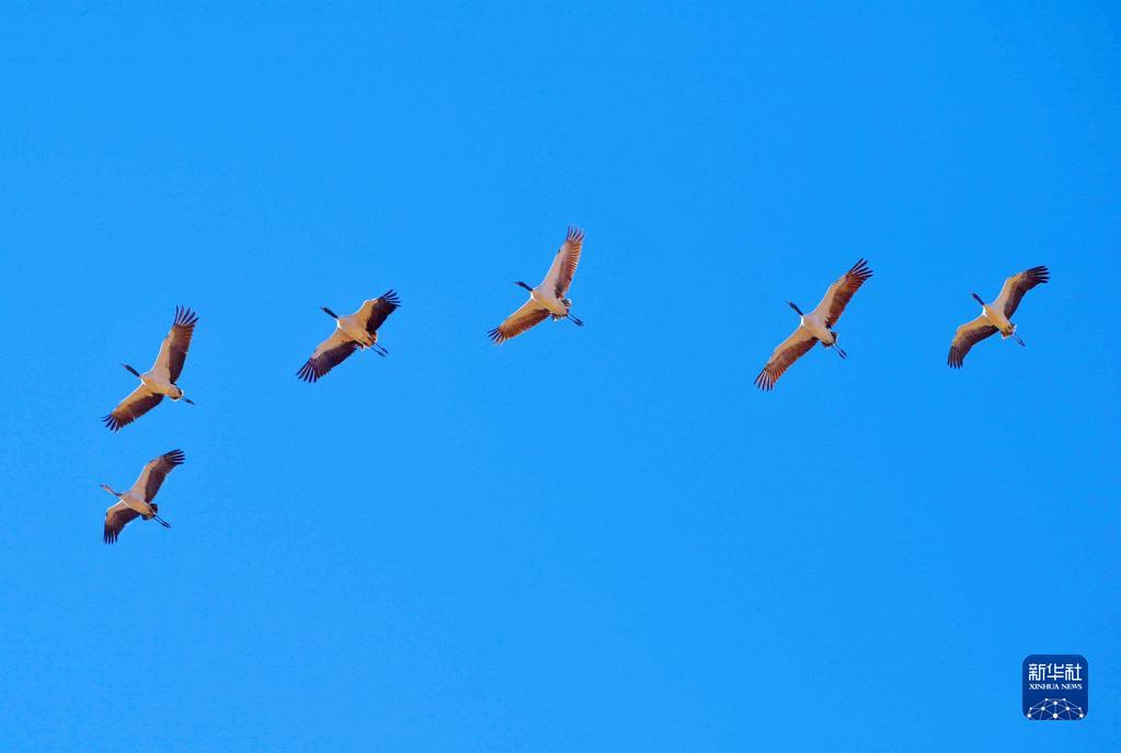 黑頸鶴在林周縣強嘎鄉(xiāng)上空飛翔(11月6日攝)。新華社記者 周荻瀟 攝