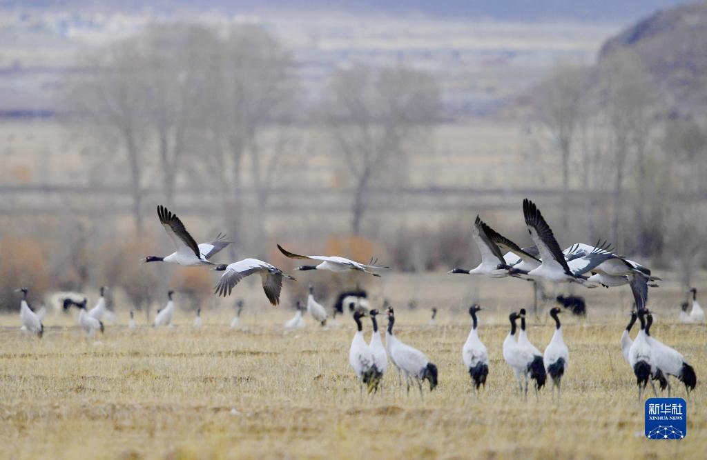 黑頸鶴在林周縣黑頸鶴自然保護區(qū)上空盤旋(11月6日攝)。新華社記者 張汝鋒 攝