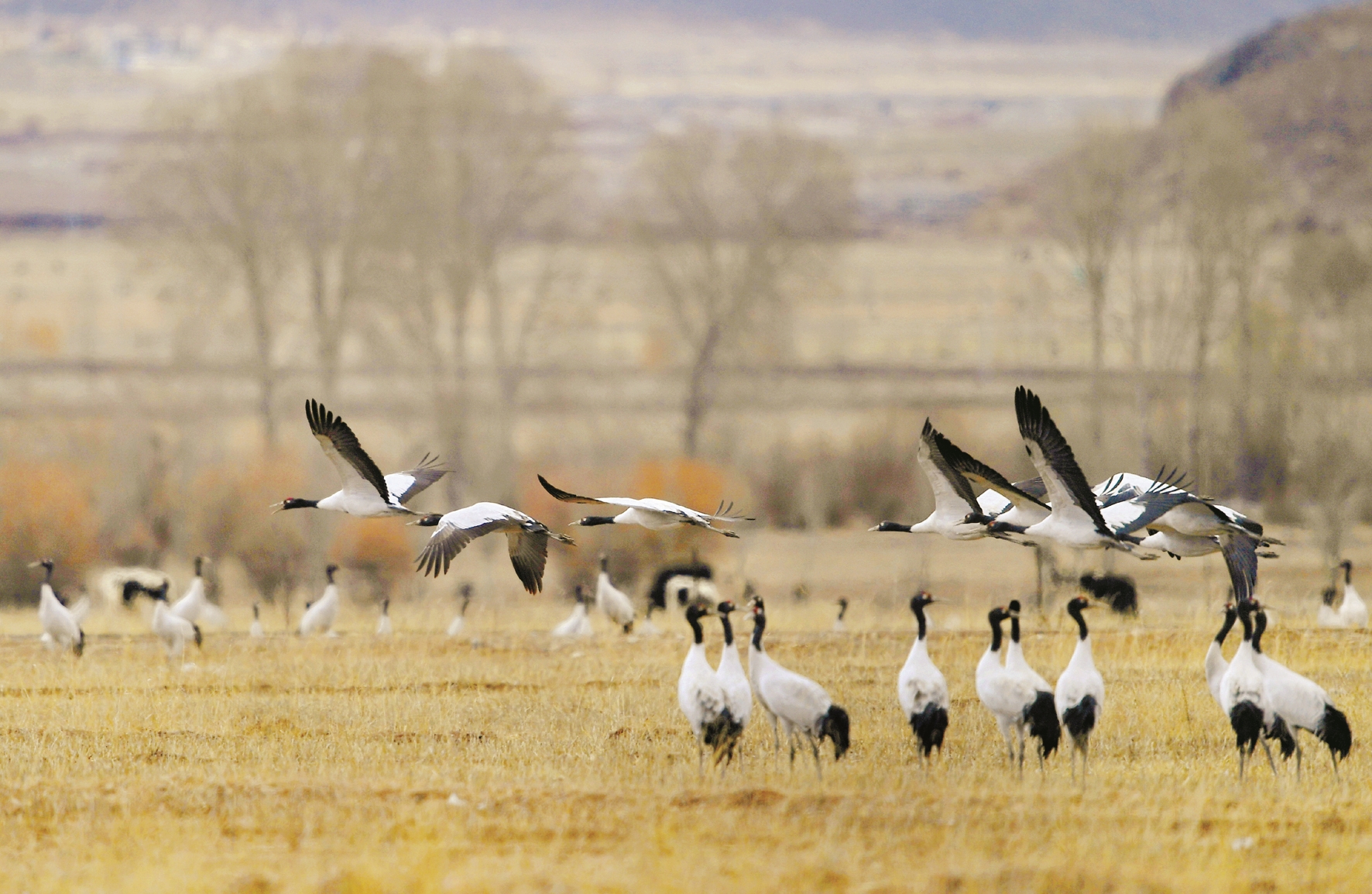 拉薩林周縣位于拉薩河上游及澎波河流域,是雅魯藏布江中游河谷地區(qū)黑頸鶴分布數(shù)量最為集中的保護區(qū)。黑頸鶴是國家一級保護動物。目前,每年到林周縣越冬的黑頸鶴已達2000只左右,林周縣區(qū)域內(nèi)的大片濕地成為黑頸鶴的“冬季樂園”。