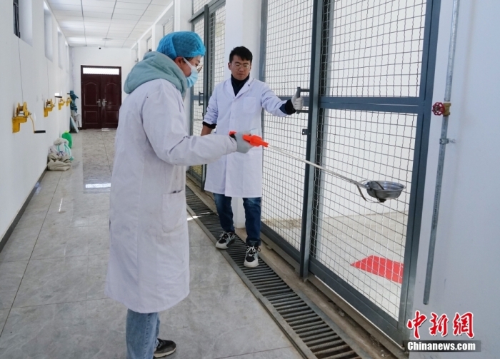 圖為1月18日,在青海省祁連山國家公園野生動物救護(hù)繁育站,李全亮和徐豐奕(左)準(zhǔn)備給動物們投食。 中新社記者 馬銘言 攝
