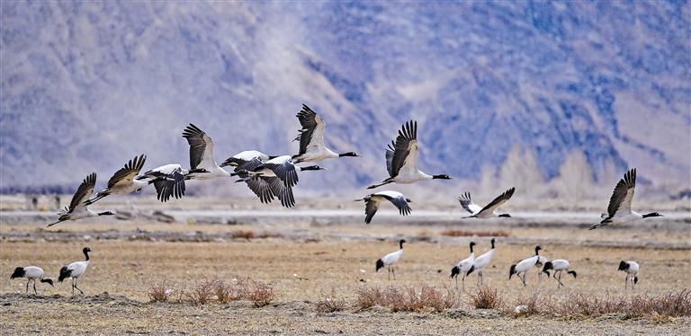 2月19日,西藏拉薩堆龍德慶區(qū)楚布溝內(nèi)的一處農(nóng)田里,一群黑頸鶴正在覓食。時(shí)下,在雅魯藏布江中游河谷一帶的農(nóng)田和水域,黑頸鶴等眾多候鳥(niǎo)或覓食或棲息,成為初春一抹亮麗色彩。黑頸鶴是國(guó)家一級(jí)保護(hù)動(dòng)物,也是唯一生活、繁殖在高原的鶴類。在河谷地帶越冬的黑頸鶴一直要待到三四月份才會(huì)北上到藏北,開(kāi)啟新的生活。