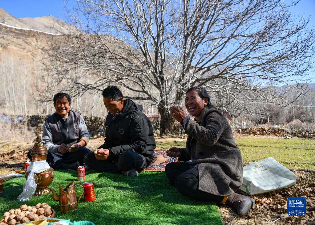 山南市加查縣拉崗村村民在核桃樹下聊天拉家常(2月1日攝)。新華社記者晉美多吉 攝