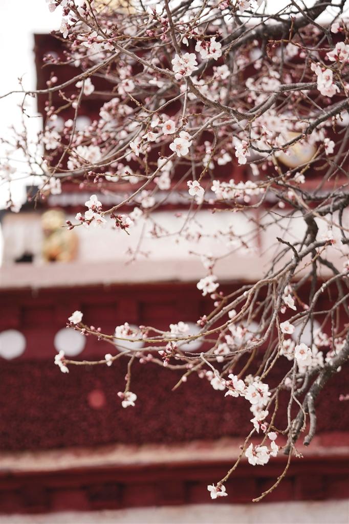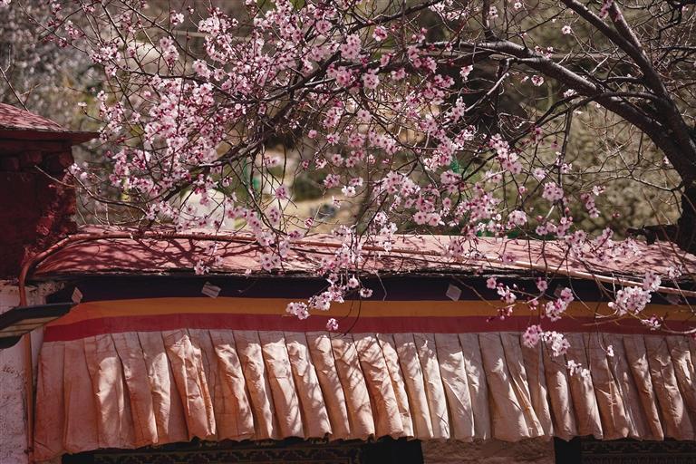 4月的帕邦喀,桃花開得正茂,桃樹枝上早已經(jīng)掛滿了大大小小的花朵,沿著石板臺階走走停停,可以看到桃樹舒展枝條,朵朵桃花爬上枝頭沐浴著春日的暖陽,在藍天白云、紅墻金頂?shù)挠骋r之下格外美麗,構成一幅絕妙的春景詩畫。偶爾枝頭傳來清脆的鳥鳴聲,讓這里顯得愈發(fā)靜謐美好。