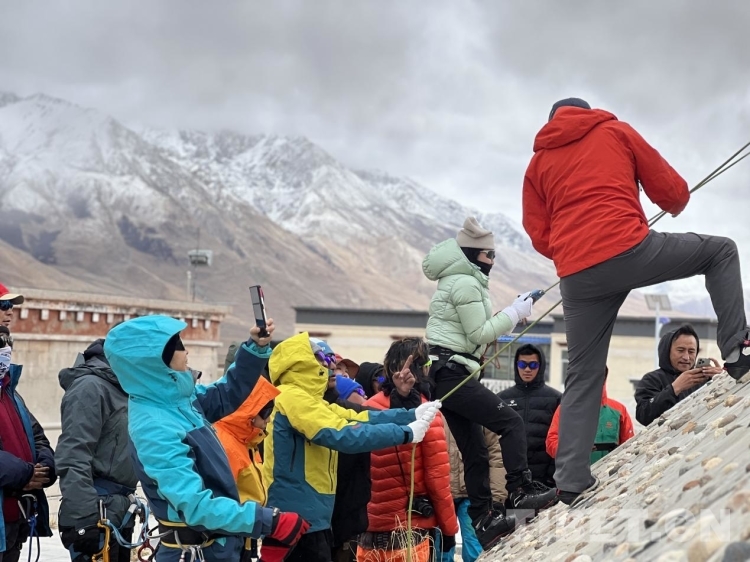 圖為登山隊(duì)專(zhuān)業(yè)教練對(duì)山友們進(jìn)行指導(dǎo) 攝影:德吉卓瑪