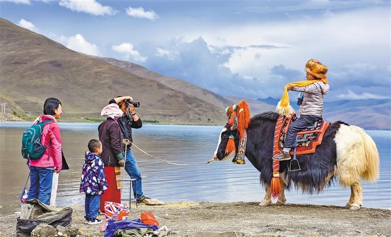 圖為游客在浪卡子縣扎瑪龍村羊卓雍錯(cuò)湖畔“打卡”。記者 劉楓 攝