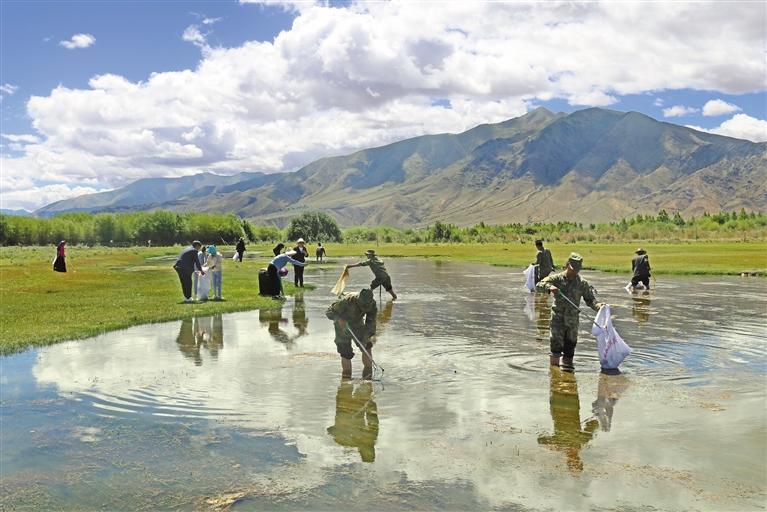 綠水青山就是金山銀山。為全面貫徹黨的二十大精神,充分尊重自然、順應(yīng)自然、保護(hù)自然,提高廣大黨員骨干的綠色環(huán)保意識(shí),近日,日喀則市桑珠孜區(qū)人民武裝部聯(lián)合桑珠孜區(qū)退役軍人事務(wù)局,組織官兵與江當(dāng)鄉(xiāng)、年木鄉(xiāng)退役軍人、民兵黨員在雅江中游河谷黑頸鶴保護(hù)區(qū)開展“呵護(hù)綠水青山”主題黨日活動(dòng)。活動(dòng)中,桑珠孜區(qū)人民武裝部組織重溫入黨誓詞,隨后,30多名黨員開展拉網(wǎng)式清理水域漂浮物和白色垃圾,給“高原精靈”營(yíng)造一個(gè)美麗舒適的“家”。