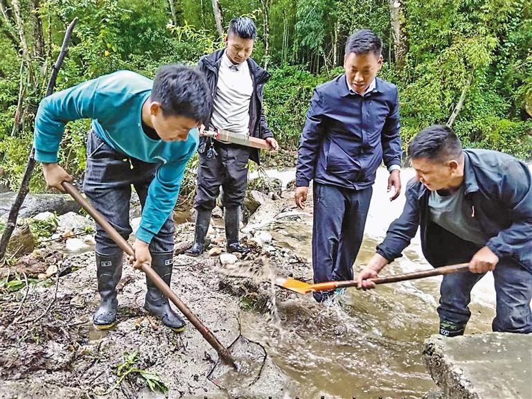 林芝市墨脫縣格當(dāng)鄉(xiāng)多龍崗村黨員干部與群眾共同清理河道。