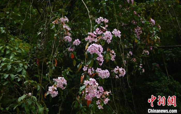 因氣候濕潤(rùn),森林里的樹上長(zhǎng)滿了藤蔓植物、蕨類植物、苔蘚。在這里,植物從空間上獲得了最大密度的生長(zhǎng)。開滿粉色花朵的植物從樹上倒掛而下,科考人員一眼辨認(rèn)出是大花水東哥,奈何正是花期無法采集種子。