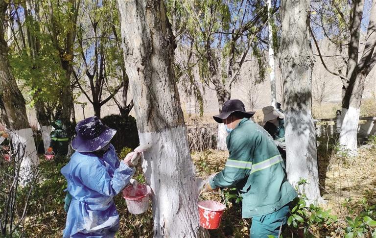 園林工人為樹木涂白防蛀蟲。 圖由拉薩城關(guān)區(qū)潔達園林綠化投資工程有限公司提供