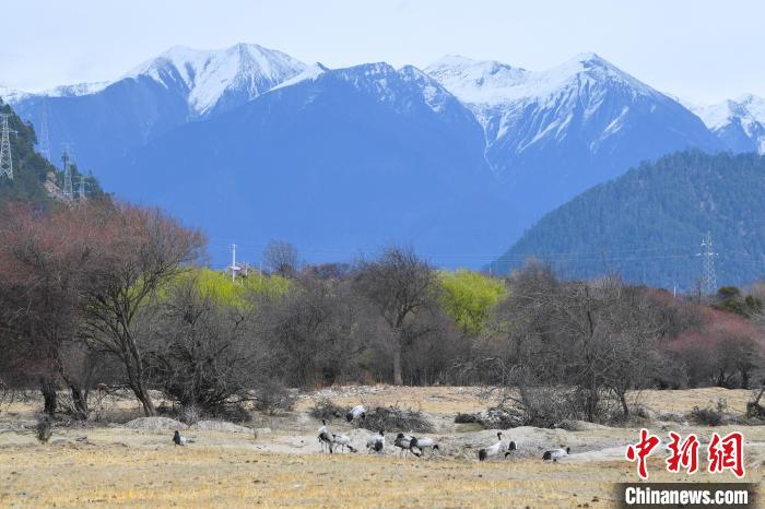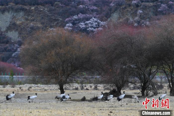 西藏林芝:黑頸鶴與雪山桃花共繪生態(tài)畫卷