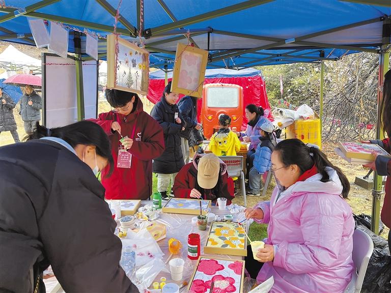 察隅縣桃花節(jié)的DIY活動現(xiàn)場,參與者將盛開的桃花作為美術(shù)素材融入自己制作的肌理畫中。
