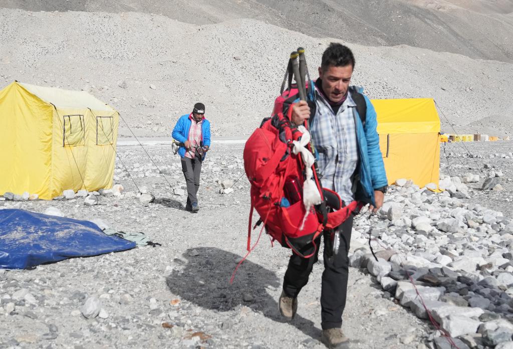 德諾埃爾兄弟和隊(duì)友們正在離開(kāi)珠峰登山大本營(yíng)前往更高海拔的營(yíng)地(5月18日攝)。新華社記者 丁汀 攝