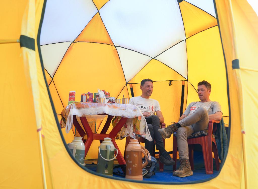 在珠峰登山大本營(yíng),帕斯卡爾·德諾埃爾(左)和多米尼克·德諾埃爾在帳篷里聊天休息(5月17日攝)。新華社記者 丁汀 攝