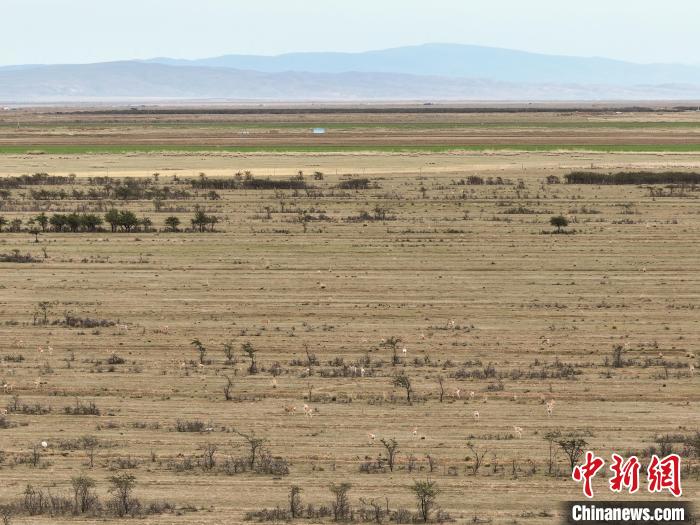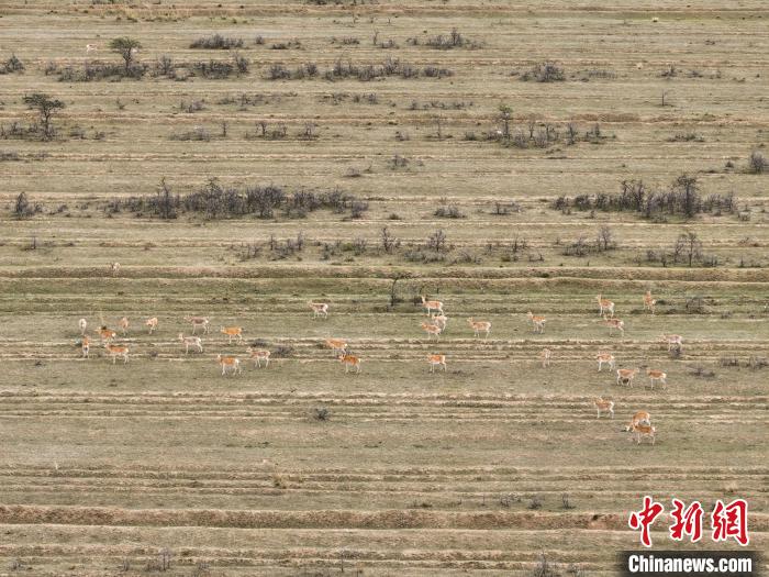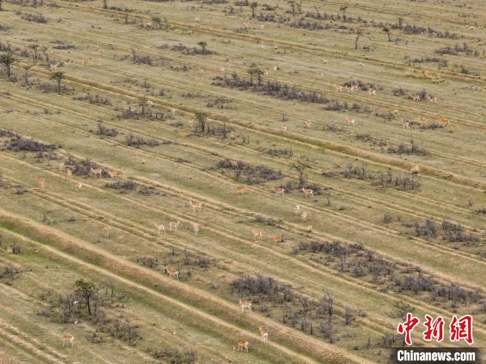 6月5日,航拍成群普氏原羚在位于青海湖北岸的青海省海北藏族自治州剛察縣哈爾蓋鎮(zhèn)境內(nèi)的草原上漫步。普氏原羚是世界上最瀕危的野生動物之一,現(xiàn)僅分布于青海湖環(huán)湖部分區(qū)域,是青海湖旗艦物種。目前,普氏原羚野外種群數(shù)量從監(jiān)測之初不足300只恢復(fù)至3400余只。(無人機照片)馬銘言 攝