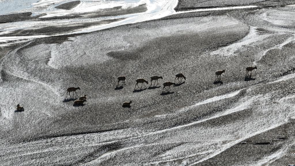 藏羚羊在甜水河畔雪地荒灘上向產羔地遷徙(6月15日攝)。