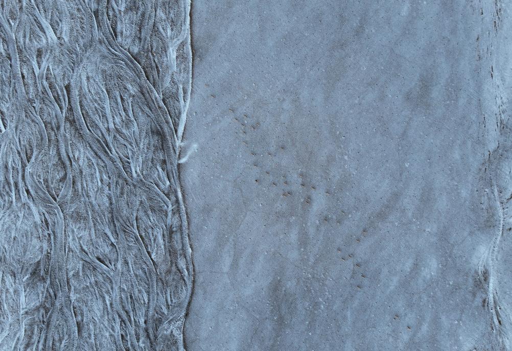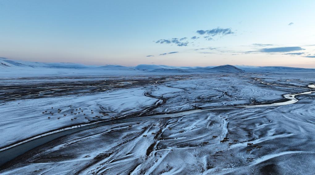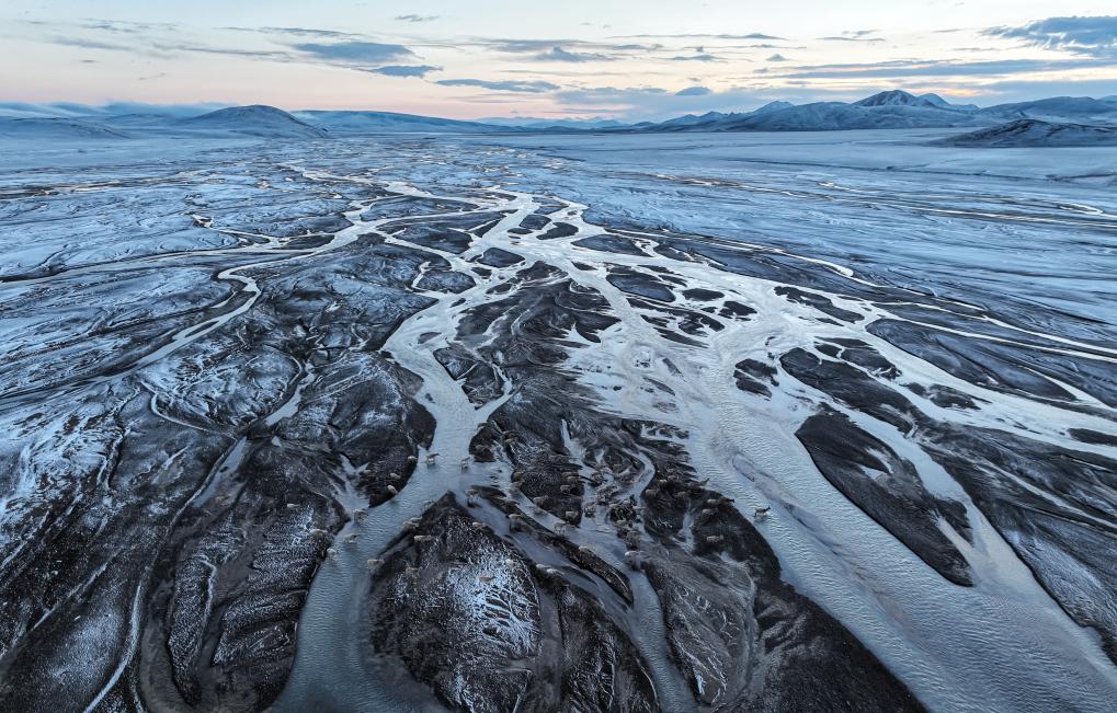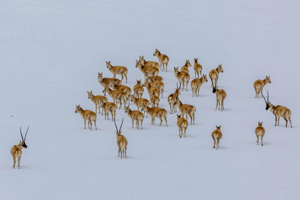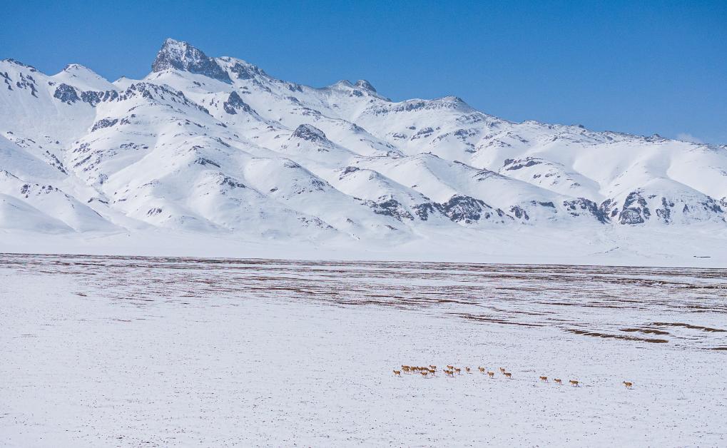 在甜水河畔荒灘雪地中向產羔地遷徙的藏羚羊(6月14日攝)。
