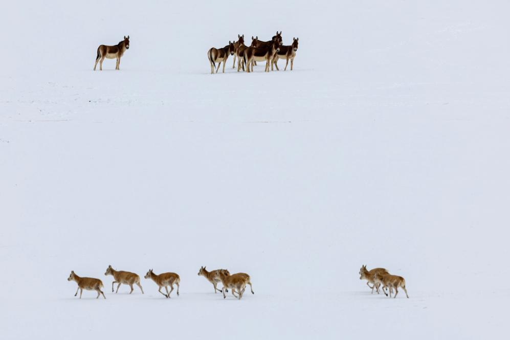 一群藏野驢在雪地中注視著遷徙的藏羚羊(5月8日攝)。