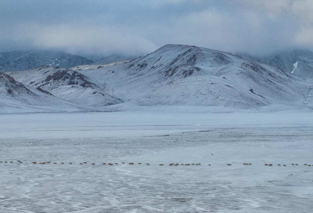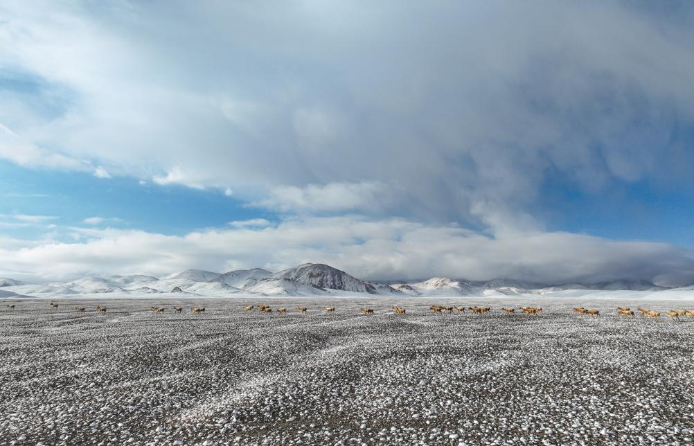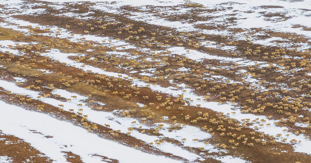 大群遷徙的藏羚羊途徑甜水河畔的荒灘雪地,向產羔地遷徙(6月15日攝)。