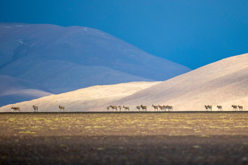 6月13日傍晚在羌塘國家級自然保護區(qū)拍攝的遷徙中的藏羚羊。