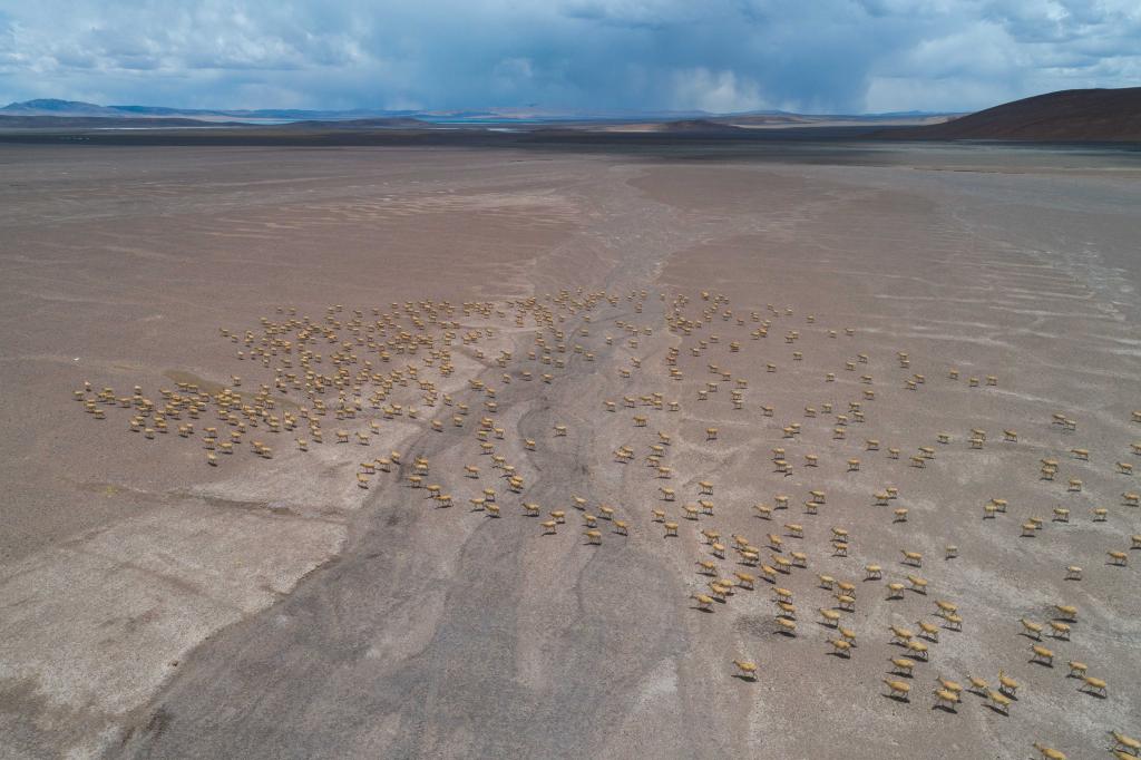 大群遷徙的藏羚羊在甜水河畔的荒灘上向產羔地遷徙(6月14日攝)。