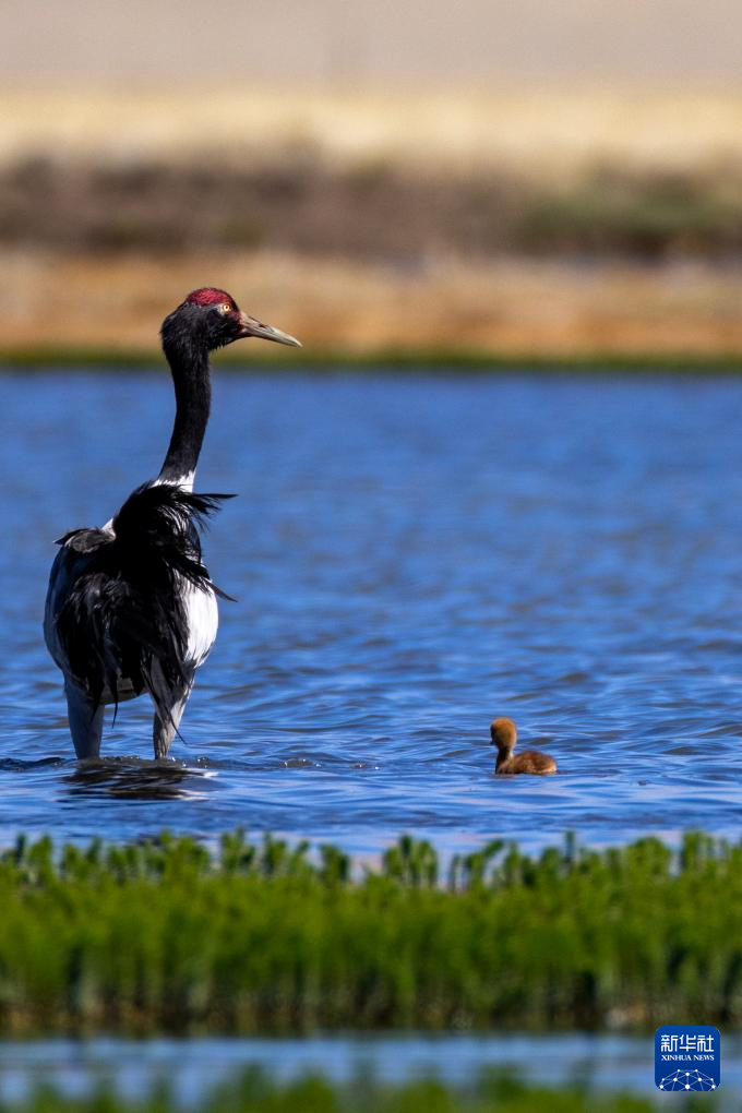 這是在那曲市申扎縣拍攝的養(yǎng)育雛鳥(niǎo)的黑頸鶴(6月9日攝)。新華社記者 姜帆 攝