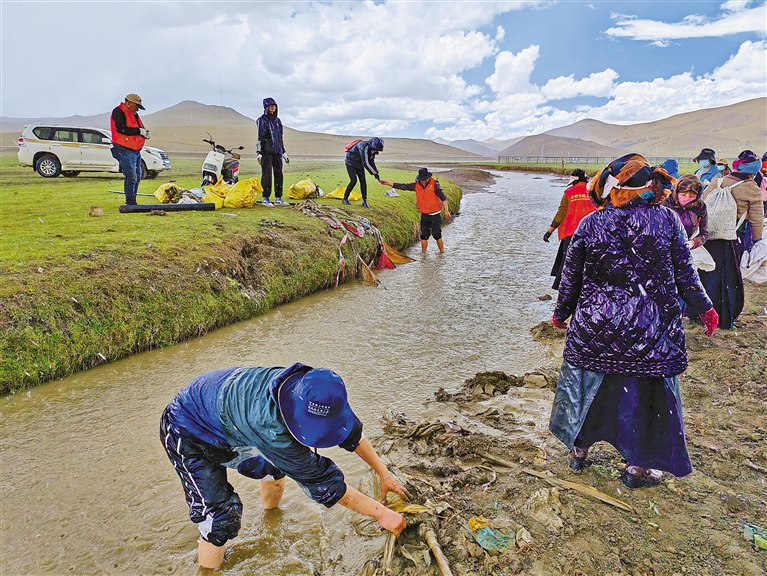 圖為志愿者在清理哲古湖畔的垃圾。