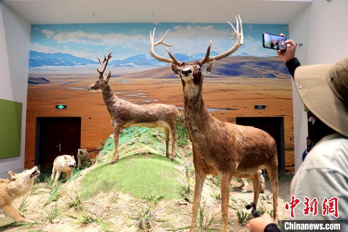 7月24日,參加“中國式現(xiàn)代化的萬千氣象·網(wǎng)絡名人青海行”活動的網(wǎng)絡名人,抵達江河源頭青海玉樹藏族自治州,在玉樹州博物館一覽自然與人文之美。玉樹州博物館是玉樹地震災后重建十大標志性建筑之一,分為序廳、自然展區(qū)、人文展區(qū)、臨時展廳。其通過實物標本等方式,展示了三江源和可可西里的野生動物、草地、森林,以及玉樹州的歷史、建筑、服飾、飲食等。圖為玉樹州博物館內的野生動物展示。中新社記者 張?zhí)砀?攝