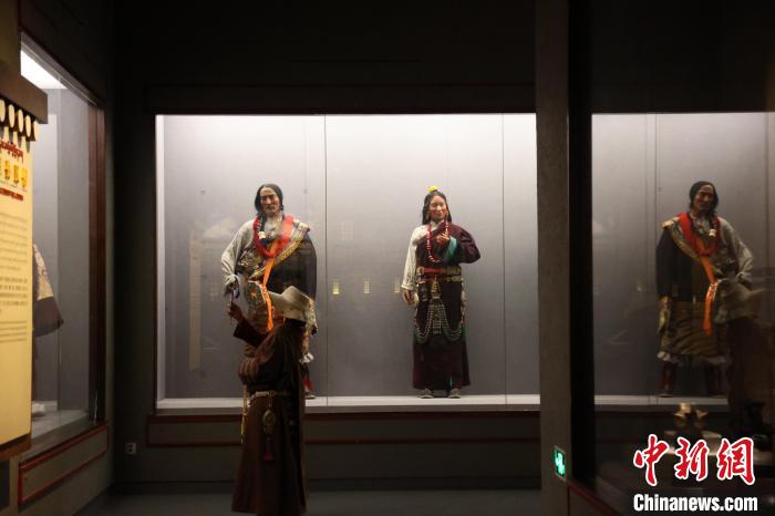 7月24日,參加“中國式現(xiàn)代化的萬千氣象·網(wǎng)絡名人青海行”活動的網(wǎng)絡名人,抵達江河源頭青海玉樹藏族自治州,在玉樹州博物館一覽自然與人文之美。玉樹州博物館是玉樹地震災后重建十大標志性建筑之一,分為序廳、自然展區(qū)、人文展區(qū)、臨時展廳。其通過實物標本等方式,展示了三江源和可可西里的野生動物、草地、森林,以及玉樹州的歷史、建筑、服飾、飲食等。圖為玉樹州博物館內的服飾文化展示。中新社記者 張?zhí)砀?攝