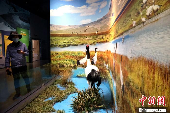 7月24日,參加“中國式現(xiàn)代化的萬千氣象·網(wǎng)絡名人青海行”活動的網(wǎng)絡名人,抵達江河源頭青海玉樹藏族自治州,在玉樹州博物館一覽自然與人文之美。玉樹州博物館是玉樹地震災后重建十大標志性建筑之一,分為序廳、自然展區(qū)、人文展區(qū)、臨時展廳。其通過實物標本等方式,展示了三江源和可可西里的野生動物、草地、森林,以及玉樹州的歷史、建筑、服飾、飲食等。圖為玉樹州博物館展示的黑頸鶴棲息環(huán)境。中新社記者 張?zhí)砀?攝