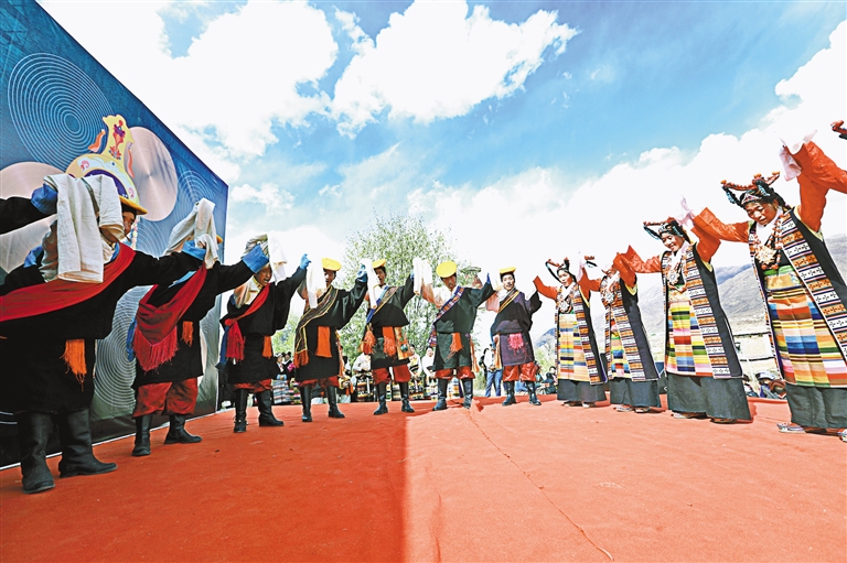 “如今,這支隊(duì)伍已發(fā)展到20多名成員,都是當(dāng)?shù)厝罕姟K囆g(shù)隊(duì)經(jīng)常受邀參加各種大小晚會(huì)、重要節(jié)日演出和赴區(qū)內(nèi)外非遺展演等,其影響力和傳播力不斷提升,特別是甲瑪諧欽《和親路》受到廣泛歡迎?!奔赚斷l(xiāng)工作人員德吉卓嘎說。