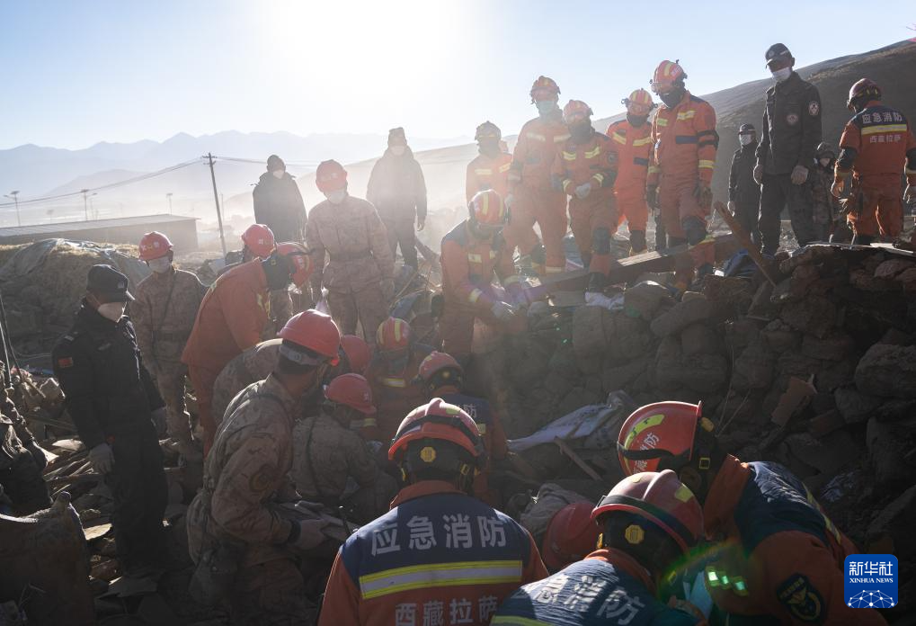 1月13日,在定日縣長(zhǎng)所鄉(xiāng)古榮村,消防員們?cè)诎徇\(yùn)從次仁扎西老人家里搶救出的青稞。新華社記者 丁增尼達(dá) 攝