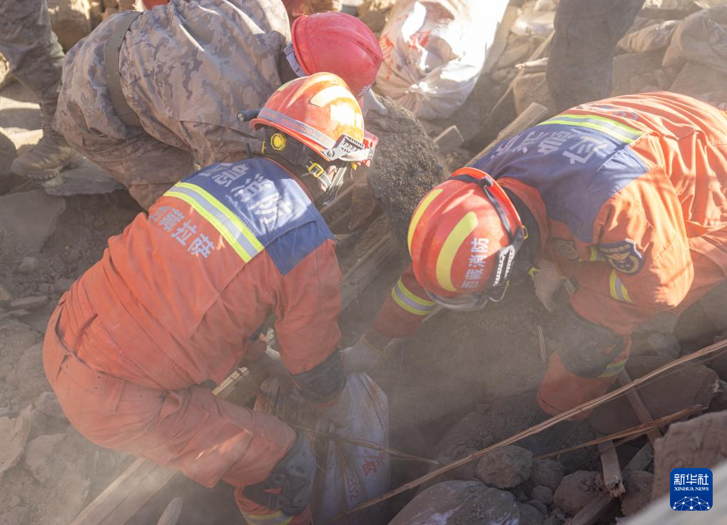 1月13日,在定日縣長(zhǎng)所鄉(xiāng)古榮村,消防員、武警官兵和公安干警在搜尋次仁扎西老人家里的青稞。新華社記者 丁增尼達(dá) 攝