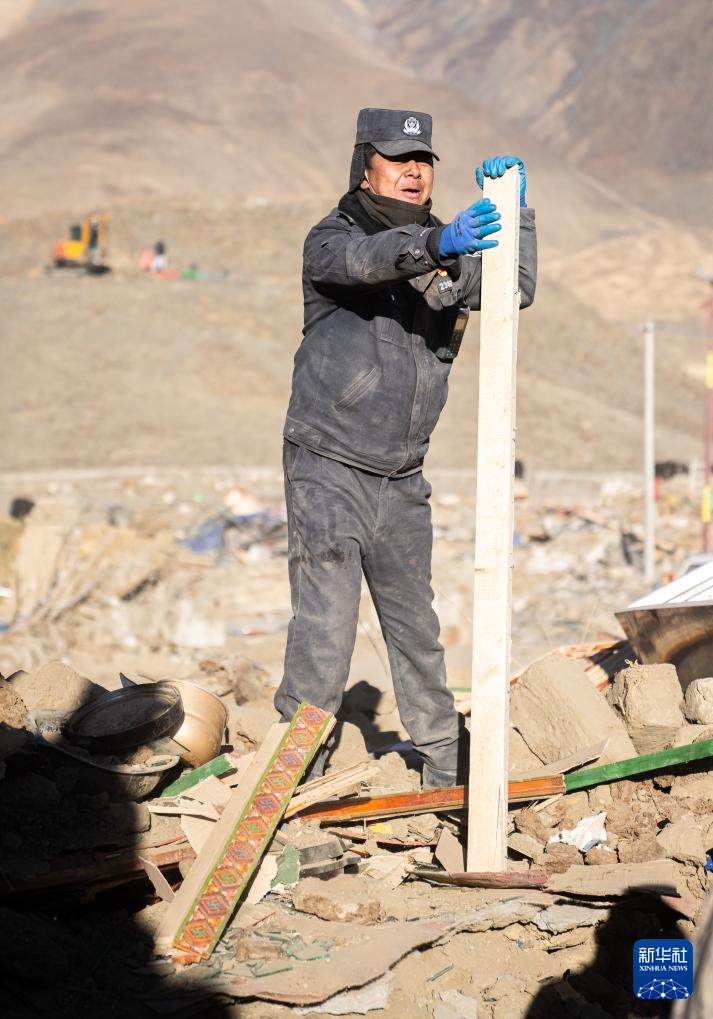 1月13日,在定日縣長(zhǎng)所鄉(xiāng)古榮村,邊巴桑珠在指揮房屋廢墟清理工作。新華社記者 丁增尼達(dá) 攝