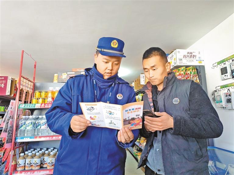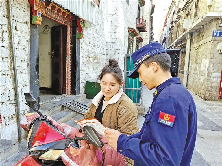 拉薩市消防救援支隊宣傳員對臨街商鋪經(jīng)營人員講解消防安全常識。