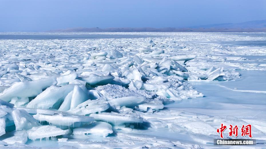 2月13日,青海省海南藏族自治州青海湖南岸,堆積在岸邊的冰塊在光線照射下呈藍(lán)冰景象,與周邊雪山、藍(lán)天、沙漠等大自然景色巧妙融合,吸引游客和攝影愛(ài)好者前來(lái)觀賞。圖為航拍青海湖藍(lán)冰。