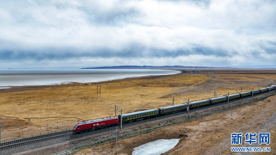 2月15日,青海湖北岸,一列火車經(jīng)過(guò)(無(wú)人機(jī)照片)。新華網(wǎng)發(fā) (宋忠勇 攝)