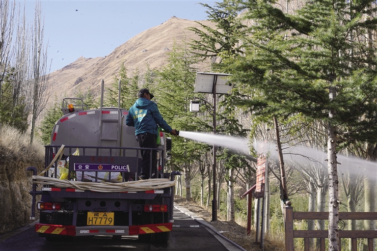 在南山公園,記者看到工人們正忙著給樹(shù)澆水。南山公園安保人員扎西次旺告訴記者:“雖然我是負(fù)責(zé)安保工作的,但是我不忙的時(shí)候也會(huì)去給樹(shù)澆水,因?yàn)檫@里的每一棵樹(shù)、每一株草對(duì)于我們而言都有非常大的意義。通過(guò)大家的努力,我相信我的家鄉(xiāng)會(huì)變得越來(lái)越綠,生態(tài)環(huán)境也會(huì)越來(lái)越好。”
