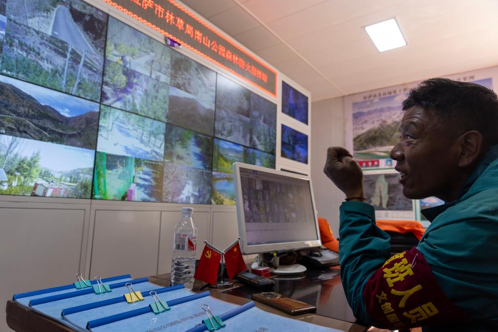 拉薩南山公園園區(qū)護(hù)林員扎西曲培正在監(jiān)控室觀察園區(qū)各處情況(3月20日攝)。新華社記者姜帆 攝